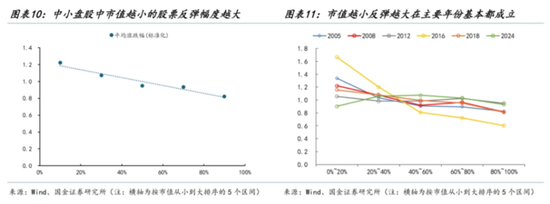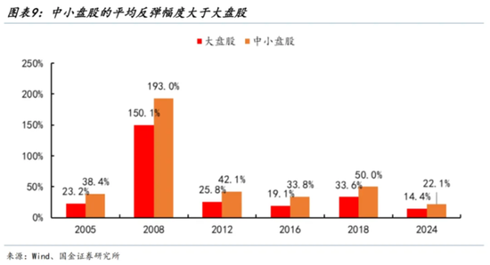 我们以市场底时总市值排名前300的公司为大盘股,其余公司为小盘股,在此基础上测算各类数据(下同),可以发现中小盘股的平均反弹幅度大于大盘股,这个结论在每次市场底后都成立。