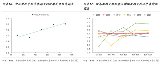 我们按“市场底”时的股息率排序,将中小盘股票分成从小到大的5区间,计算每个区间股票的平均涨幅。从结果可以发现,中小盘股中股息率越大的股票反弹幅度越大,且这个结论在2016、2018和2024年的三个年份中尤其显著。