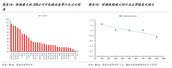 在下跌幅度最大的20%公司中,我们统计了各行业出现的频率,可以发现主要以周期和成长类风格公司为主,出现频率最高的行业主要包括机械设备、电力设备、基础化工、医药生物、电子、计算机等。另一方面,如果以行业指数为基础,可以发现前期跌幅越大的行业反弹幅度也越大。