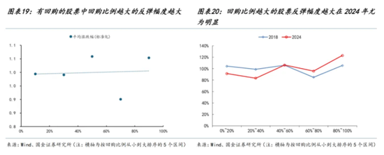 在考察回购因子中,我们发现反弹区间有回购的公司的平均涨幅大于没有回购的公司(2016年及以前回购股份的公司数量较少,参考意义低,未放入结果)。而在有回购的股票中回购金额占流通市值比例越大的反弹幅度越大,这一点在2024年尤为明显。
